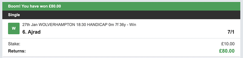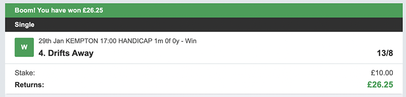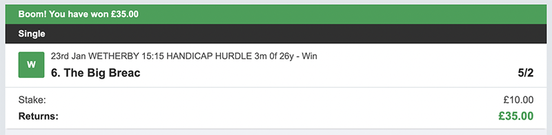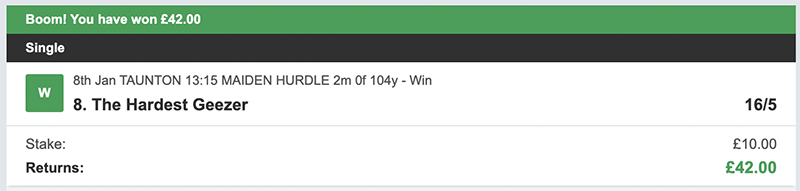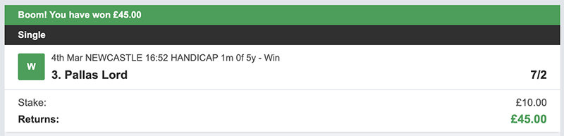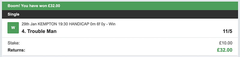 I make my picks on a daily basis, I bet Monday to Saturday each week, there will always be 3 selections and my advice is to back them to win but also place the trixie bet, as you can see from the resutls on days we get it right we get paid handsomely.