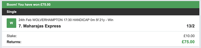 No returns on the Each Way Patent for a -£70.00 Loss